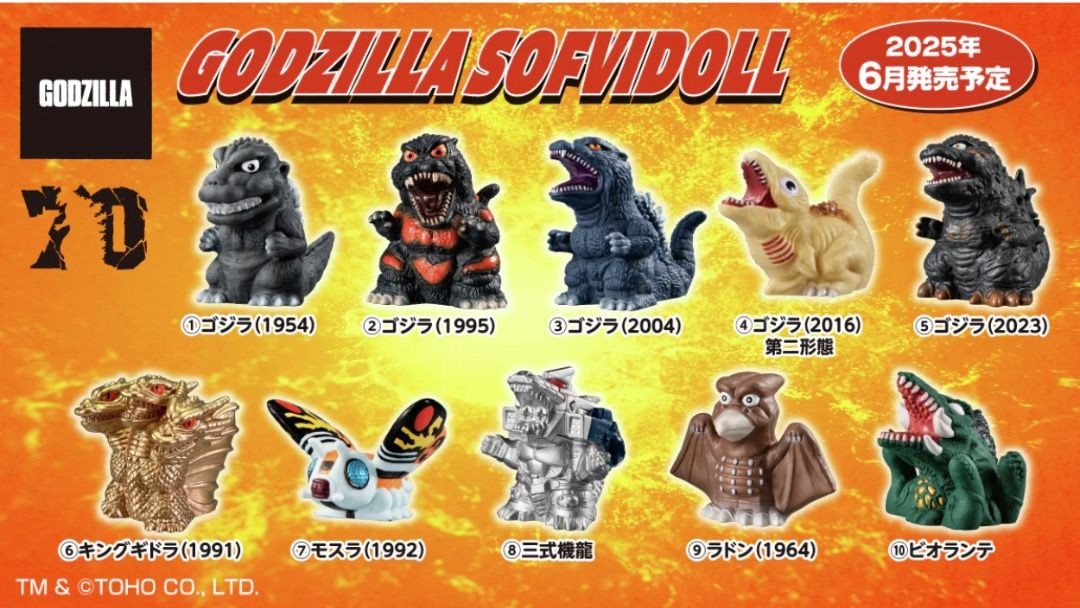 Bandai brings us a new lineup of "Godzilla" soft-vinyl finger puppets as part of their "SofviDoll" series! These mighty monsters are intensely detailed while also being cutely super-deformed; this completely new series was commissioned to Shinji Nishikawa, who has been responsible for the design of monsters and mecha in many "Godzilla" works. There are ten different monsters to collect and trade, randomly packed in boxes of ten. Place your order today!