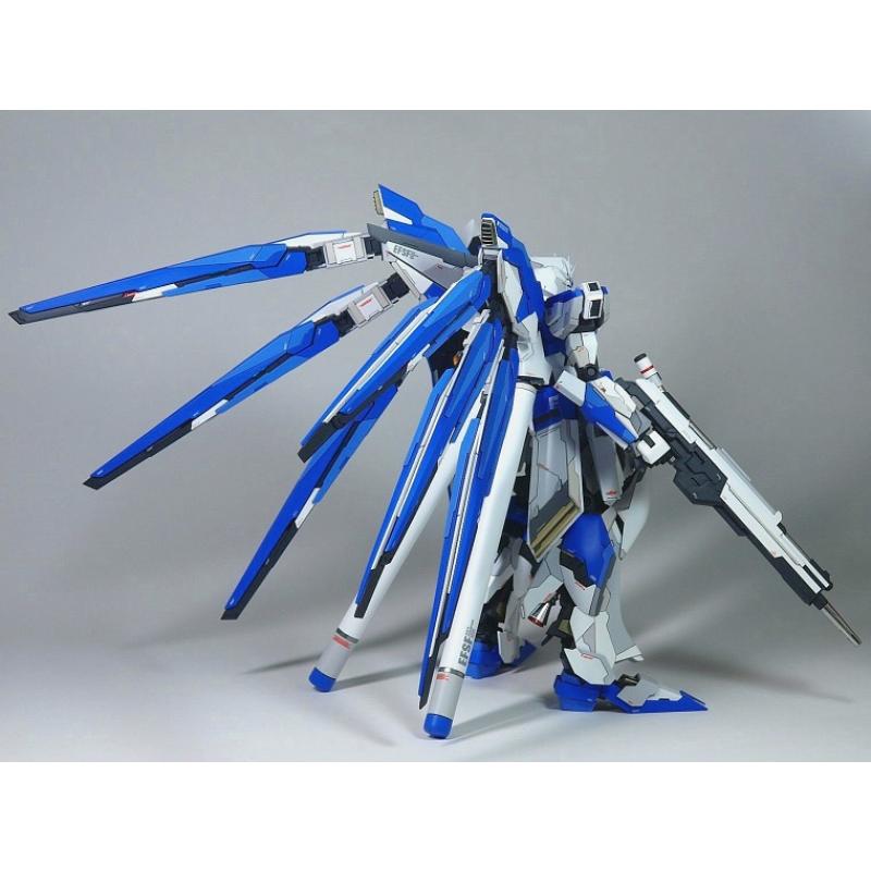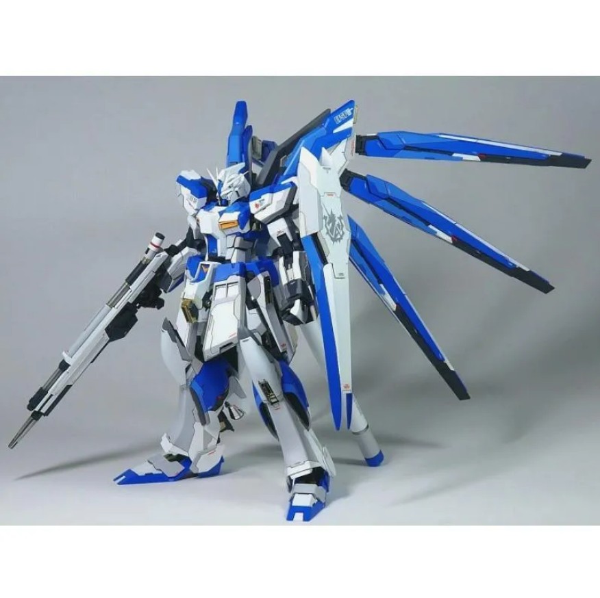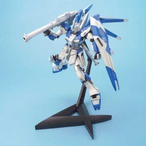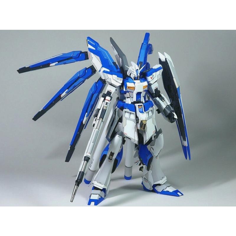 A master-grade 1/100 model of the Hi-ν Gundam from Mobile Suit Gundam: Char’s Counterattack - Beltorchika’s Children, featuring its iconic blue-and-white color scheme, advanced funnel system, and enhanced articulation.