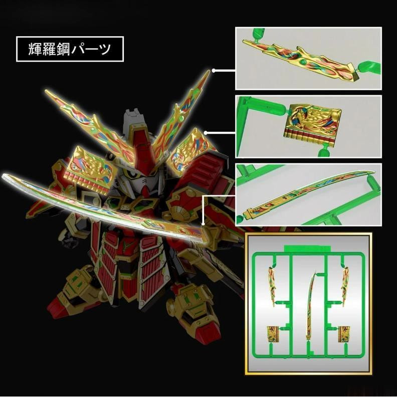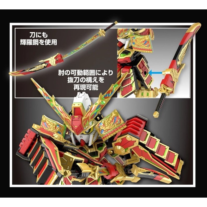 The new generation of SDW Heroes, "Musha Gundam" proudly enters the battle with Kirako! The Kirako parts are made with an in-mold technology that performs injection molding and film attachment at the same time, to produce parts that have a rich, gleaming appearance! "Kira steel" is used for the sword, and the stance of drawing a sword from its sheath can be easily reproduced thanks to the superior range of motion in his elbows! You can also use the Kirako parts included with SDW Heroes Onmitsu Gundam Aerial!