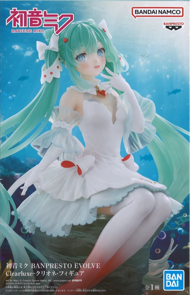 Add to your Vocaloid collection with the Banpresto Evolve Clearluxe Hatsune Miku (Clione) figure by Banpresto! This figure is around 7 inches tall and displays the memorable Hatsune Miku in a cute white outfit while sitting on a clear base. Be sure to add it to your collection!
