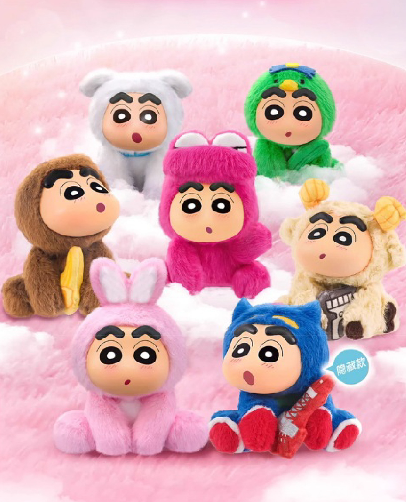 This plush blind box showcases Shinchan in a seated position, dressed in cute and cozy party outfits. Each plush is designed with soft textures and bright colors, perfect for display or cuddling.