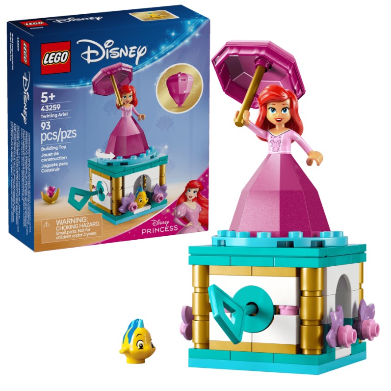 - Engaging building toy – Turn the key on the stand to spin the plate and twirl Ariel around, then store the LEGO® ǀ Disney mini-doll figure inside the ’diamond’ dress using the umbrella as a lid