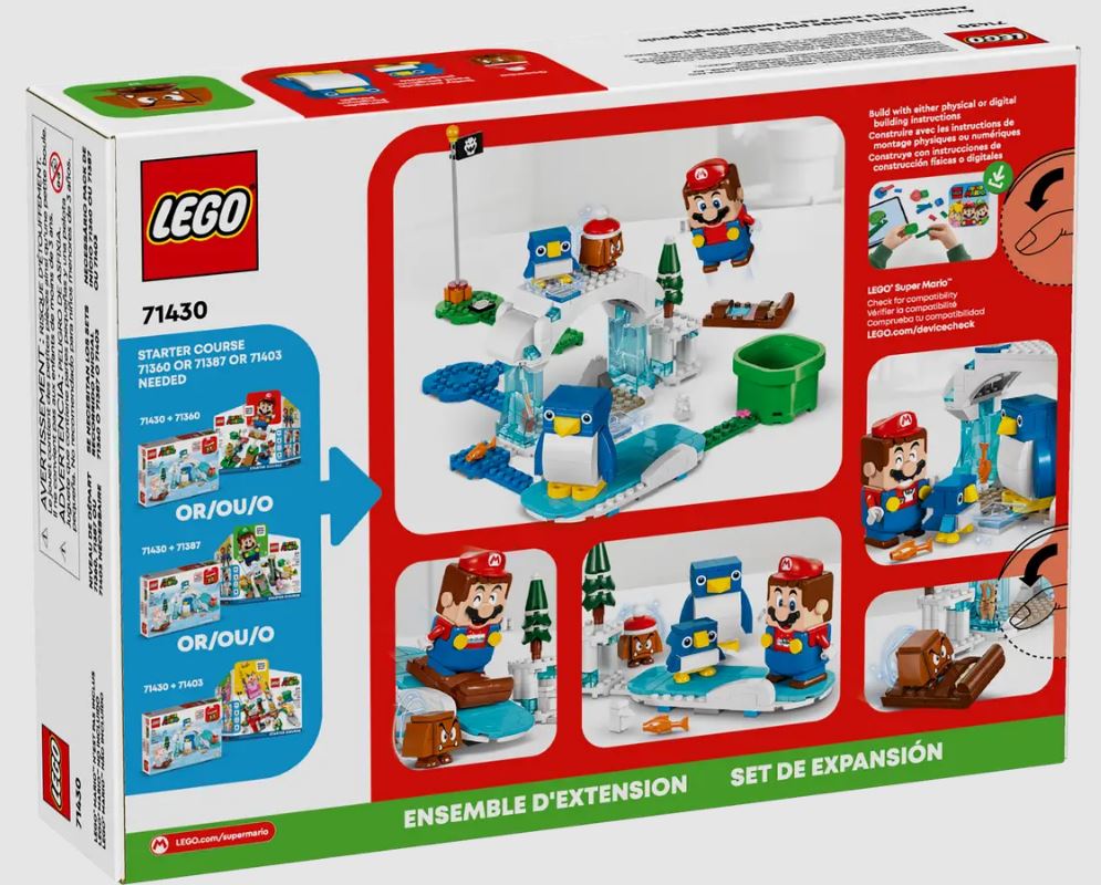 For interactive play, add a LEGO® Mario™, LEGO® Luigi™ or LEGO® Peach™ figure from a LEGO Super Mario Starter Course (71360, 71387 or 71403 – each sold separately) and earn digital coins for reuniting the baby penguin with its parent, defeating the Goomba, and more.