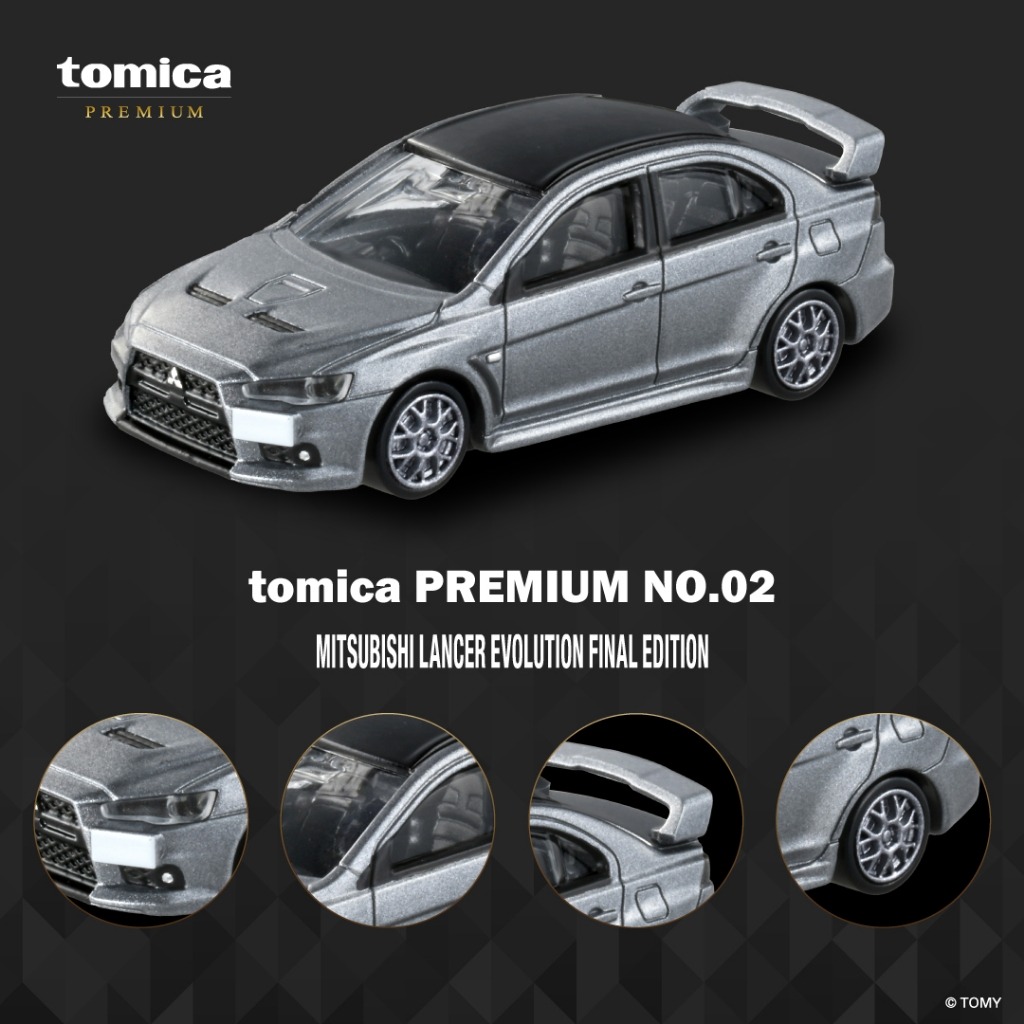 Tomica Premium No. 02 Mitsubishi Lancer Evolution Final Edition is a toy released within the Tomica Premium toyline. The toy includes the main figure of the Mitsubishi Lancer Evolution Final Edition.